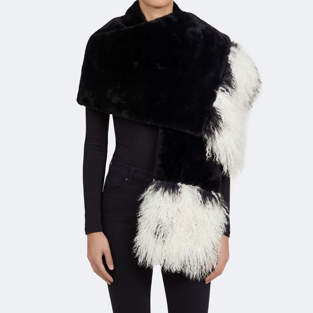 The Solenne Shearling Cape can be worn draped as a luxurious scarf or fastened as a poncho-style cape using a lobster clasp at the neck or chest. Designed for warmth without sacrificing style, it features a hidden pocket and a fluid, sculptural drape.